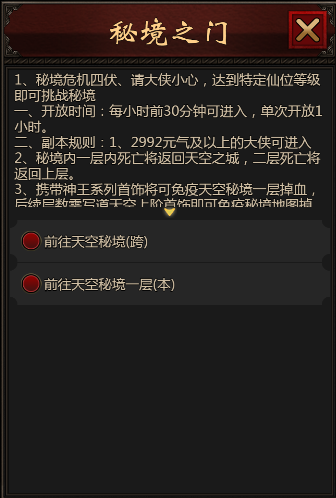 气温骤降,寒气笼罩,冬天的韵味愈发浓厚。江湖即将迎来新一波更新,全新篇章「天空之城」重磅来袭,快来抢先看看吧~ 本文仅供参考 开发阶段实际以游戏更新上线为准 1、元气满2992的角色上线自动接取支线任务,与长城以南NPC空域仙人(533:490)对话即可获取初始飞剑; 2、飞剑可在长城以南、天空之城内使用,御剑飞行穿越障碍。 天空之城地图 1、天空之城NPC空域仙人(481:519)处可进行天空装备强化; 2、装备进阶: ①飞剑、武器、帽子、护腕、铠甲、战靴、令牌、首饰、内甲、内衬、护腿可消耗对应的材料进行进阶。(神王系列首饰、内甲、内衬、护腿可收集材料直接进阶为天空一阶装备); ②进阶时可预览进阶后属性; ③装备进阶后将保留原除段位外的所有属性于进阶后的装备上(包含宝石转移、仙化属性); ④飞剑进阶后将保留升级属性、仙境属性。 3、装备仙化(天空系列装备可进行装备仙化): ①装备仙化属性可通过进阶到新装备上; ②装备仙化有失败的概率,仙化失败装备会保留当前等级,具体仙化概率请在官网查看; ③装备仙化可以百分比提高装备的部分基础属性(在升段后的基础属性上额外提升); ④可提升的基础属性有:身攻、头攻、手攻、腿攻;身防、头防、手防、腿防;命中、闪躲、维持、恢复。 4、仙宝升级: ①可消耗对应的材料对仙宝进行升级(当前仙宝包含:飞剑); ②仙宝升级可以使仙宝获得额外的强化属性; ③仙宝升级到指定等级后,可以消耗对应特殊材料激活仙宝的仙境属性。 5、四层武功兑换(开发阶段,实际消耗以游戏更新上线为准); 6、四层武功属性预览(开发阶段,实际属性以游戏更新上线为准)。 1、击杀天空系列副本内的怪物可获得空域经验,可前往商城购买“空域双倍经验丹”加快经验获取速率; 2、空域经验可进行累计叠加,经验值达升级条件时,消耗对应材料可进行感悟升至下1等级; 3、每次升级后将降低“天道压制”buff的比例,天空全系列副本均携带天道压制; 4、怪物存在获取经验最大等级限制,超过该等级/累计经验值超过该等级时击杀怪物只可获取1点经验,若经验已达最大等级上限,则无法获取; 天空之城:10级 天空秘境一层:30级 天空秘境二层:40级 天空秘境三层:50级 5、仙类属性、装备(包含装备上所有属性)、武功属性(角色穿着的武学特效,不包含斗魂)不会受到天道压制影响。 元气满2992及以上的角色可挑战秘境,每小时前30分钟可进入,单次开放1小时。